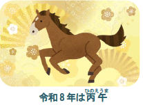 今年の干支は午年(うまどし)、十干は丙(ひのえ)、つまり「丙午(ひのえうま)」の年です。